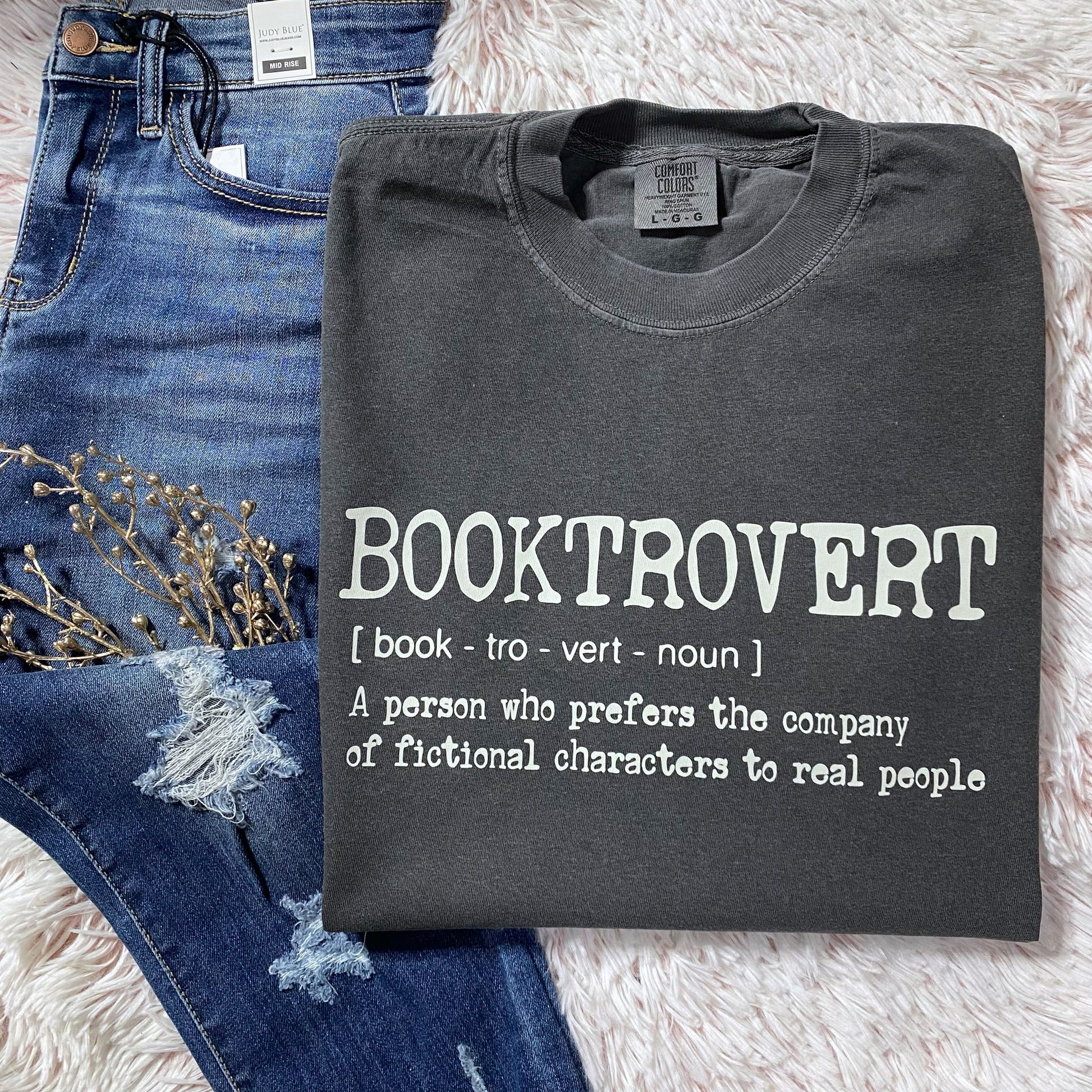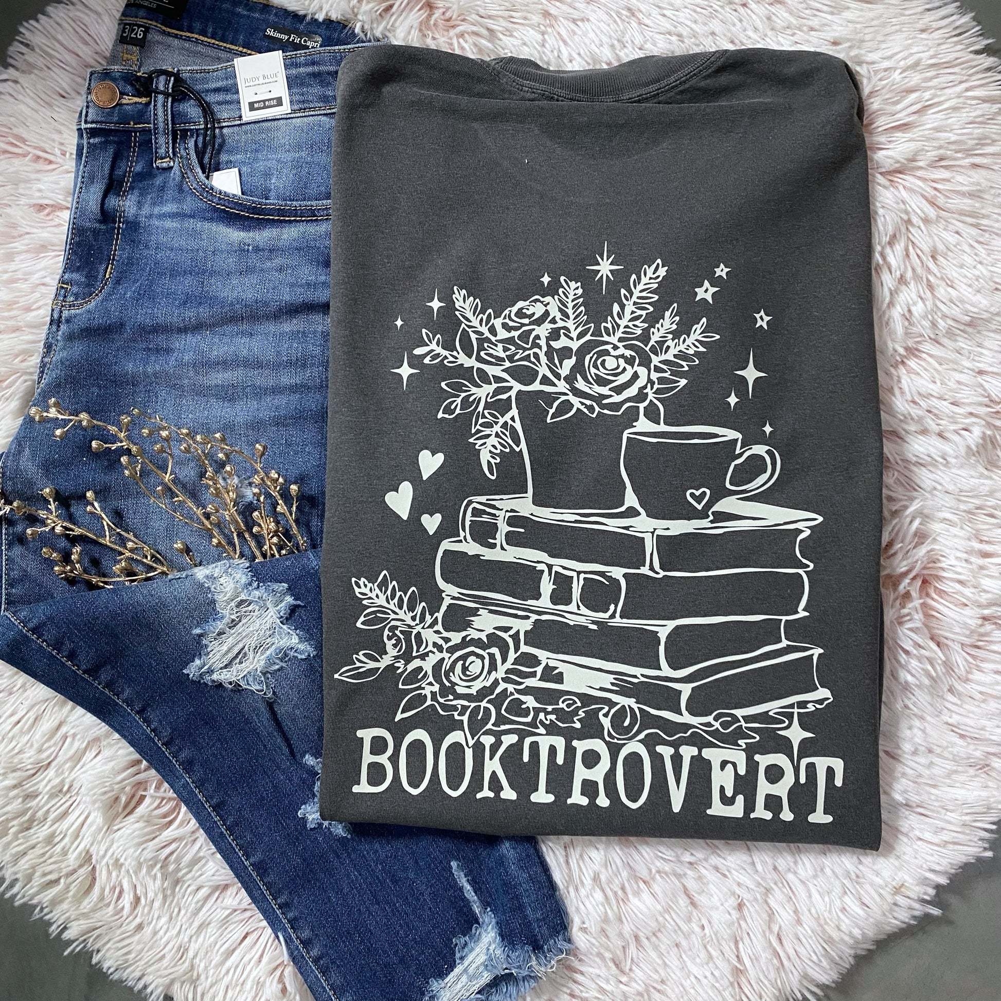 Introducing Booktrovert - the perfect design for book lovers who prefer the company of fictional characters. Featuring a fun definition and cute floral book stack on the back, this shirt will make any introverted reader stand out (but in a subtle way).
