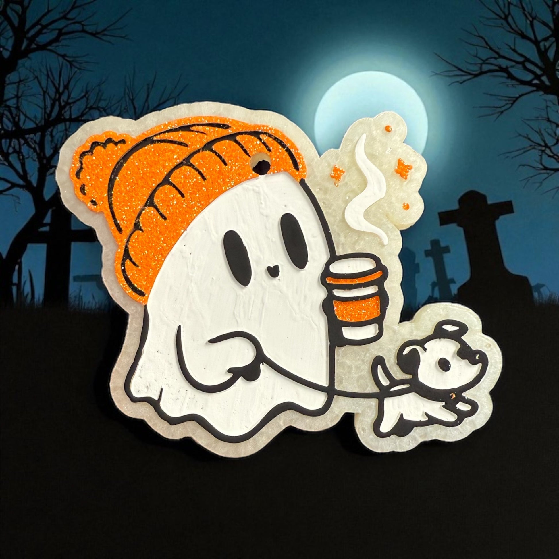 Kickstart your day with the Coffee Run Freshie! Featuring a charming ghost holding coffee and walking a dog, highlighted with vibrant orange glitter accents, this freshie is perfect for your car or home. Available in all scents, it’s an ideal gift that combines spooky fun with a fresh, inviting aroma. Don’t miss out on adding this playful and fragrant touch to your space!