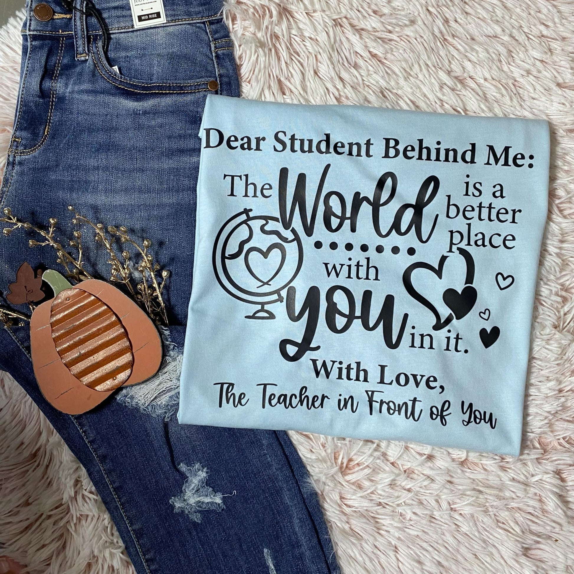 Put a smile on your classmates' faces with the Dear Student behind me tee. Not only does it add a playful touch to your outfit, but it also shows your support for your fellow students. (Note: May cause slight envy in those stuck with boring tees.)