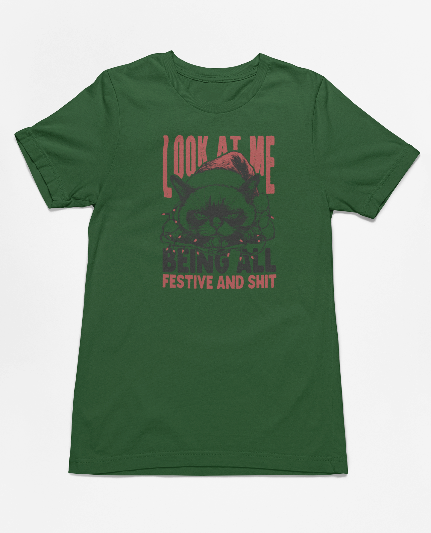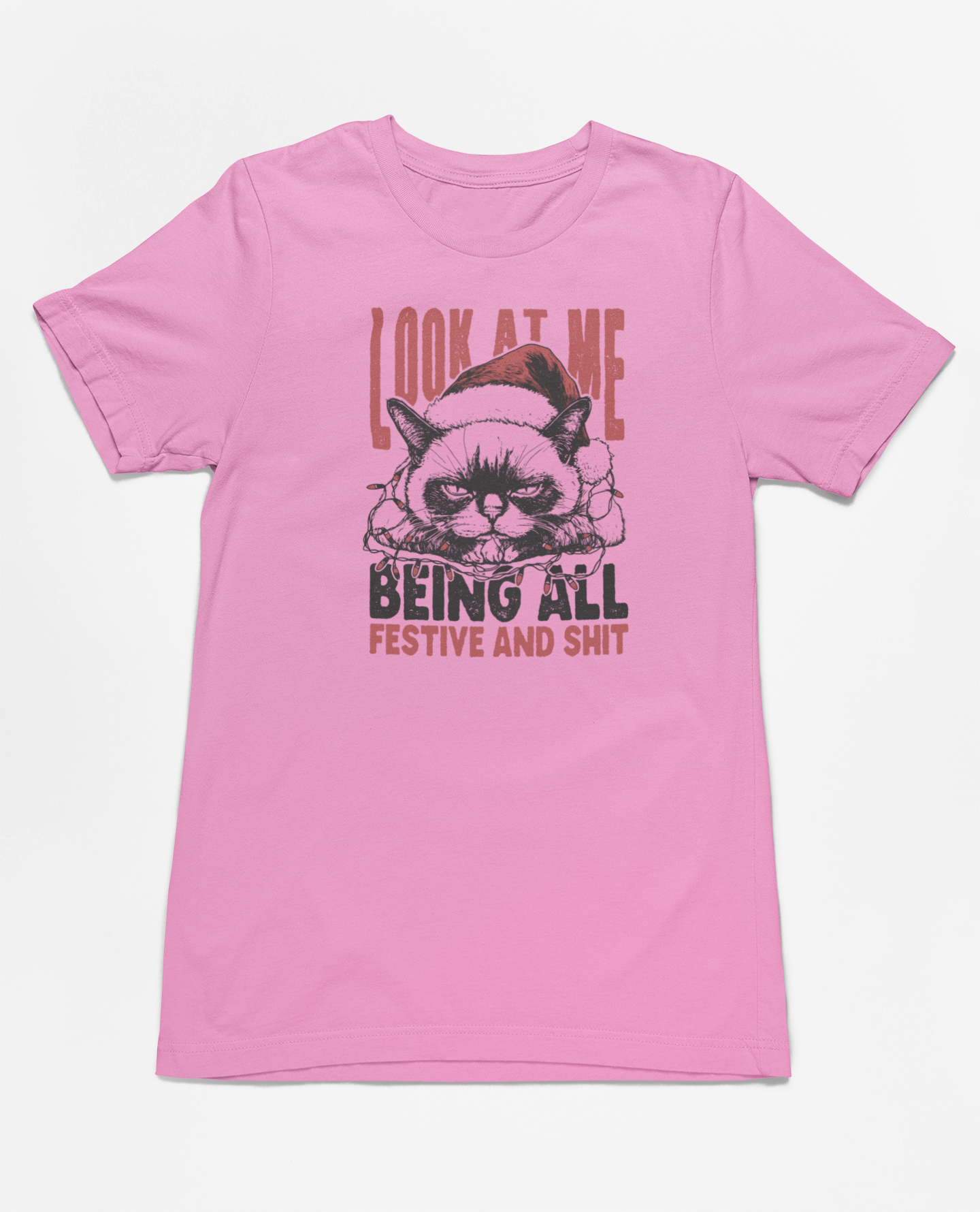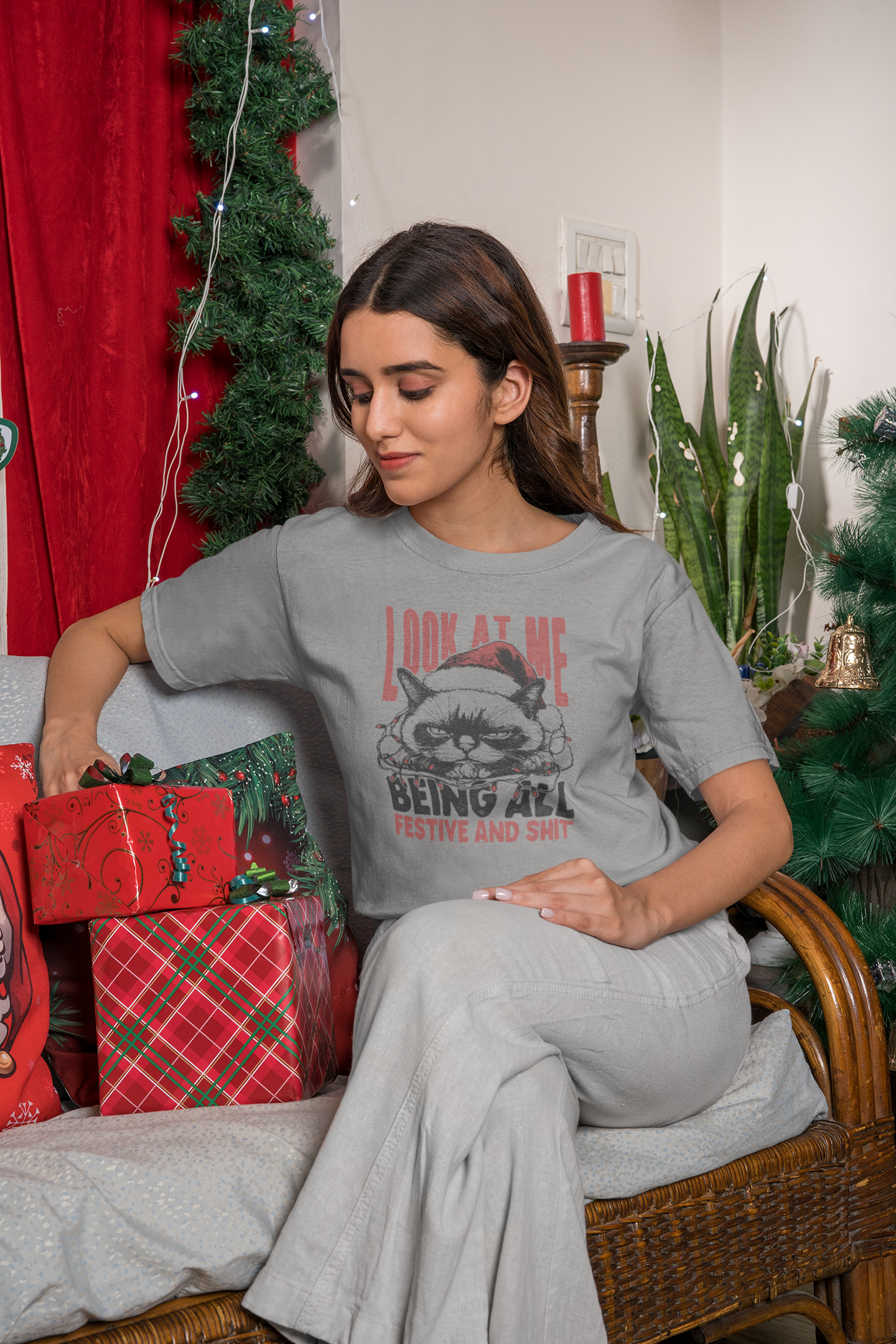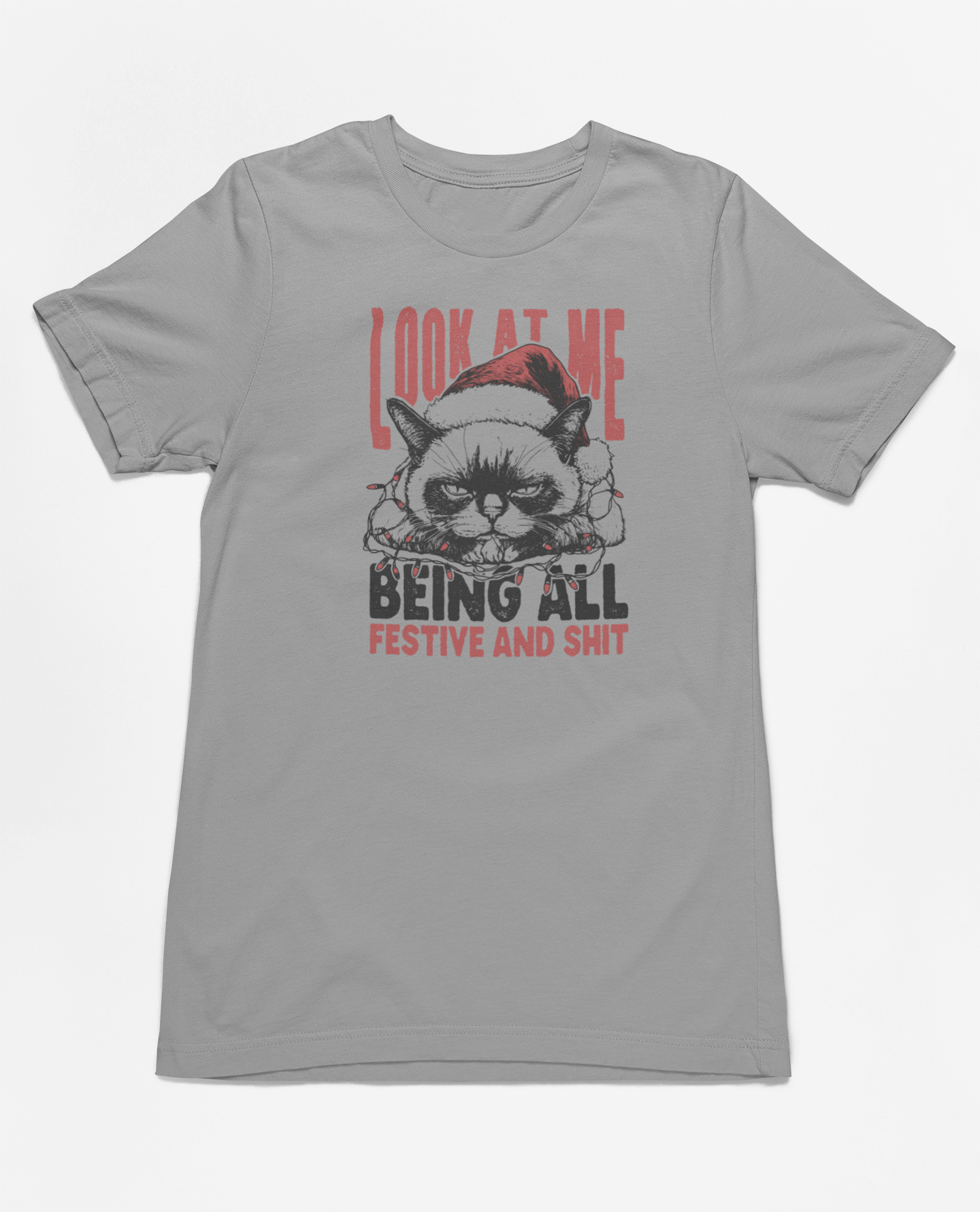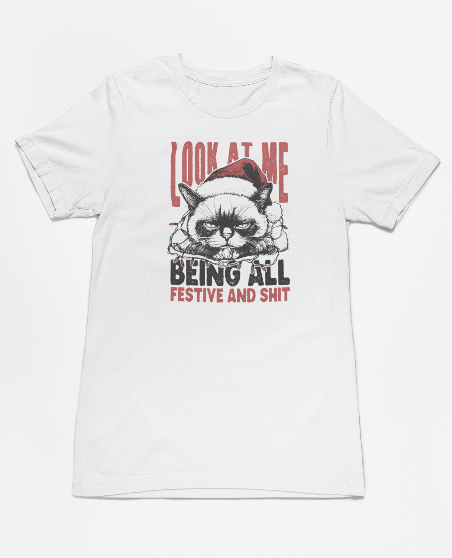 Channel your inner holiday sass with our "Festive Grumpy Cat" graphic tee! Featuring a hilariously unimpressed cat rocking a Santa hat and surrounded by Christmas lights, this shirt is perfect for anyone who loves sarcastic humor during the holidays. Made from ultra-soft fabric, it’s great for cozy nights, festive gatherings, or just showing off your witty side. Grab this funny holiday tee today and bring some much-needed laughs to the Christmas season!