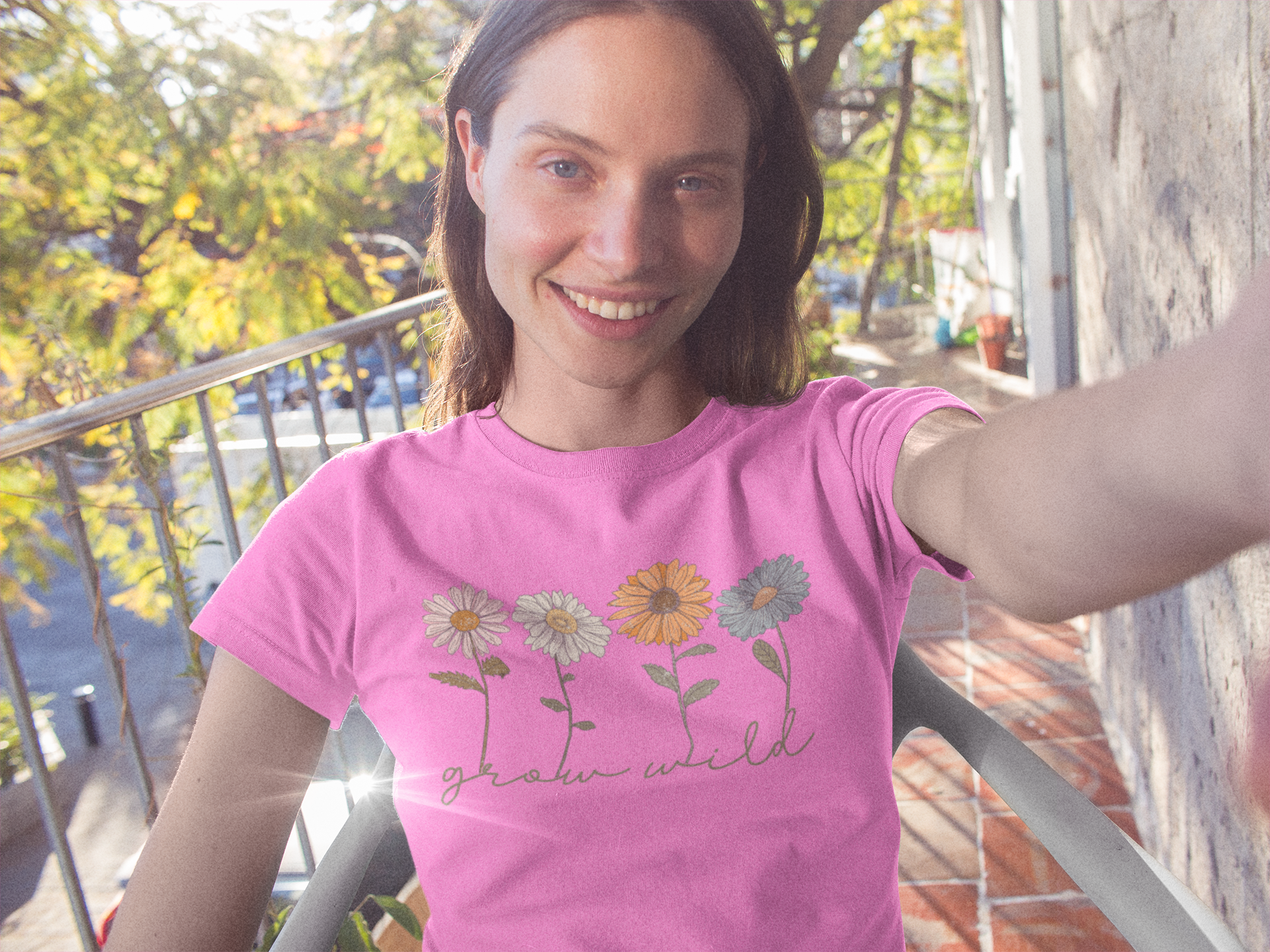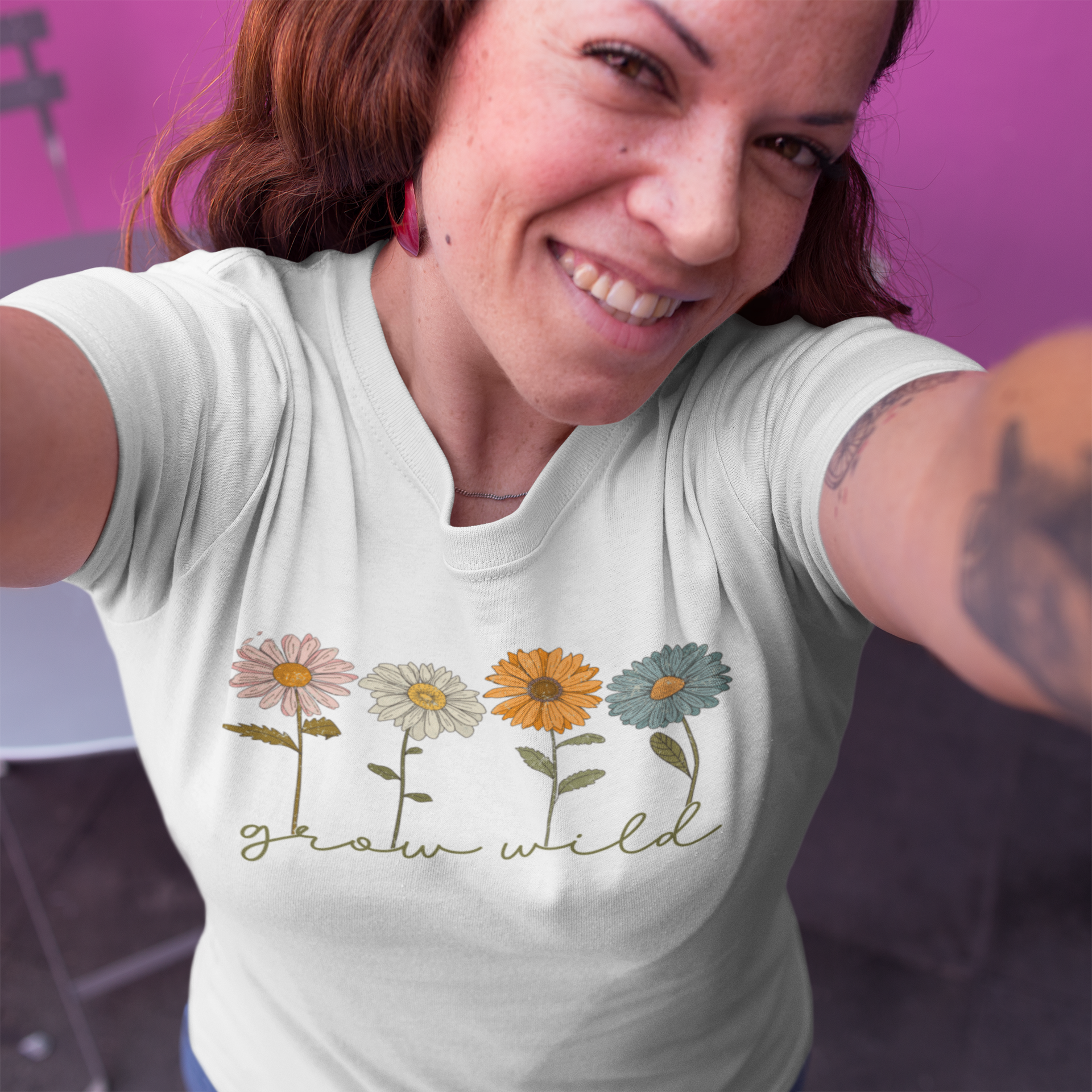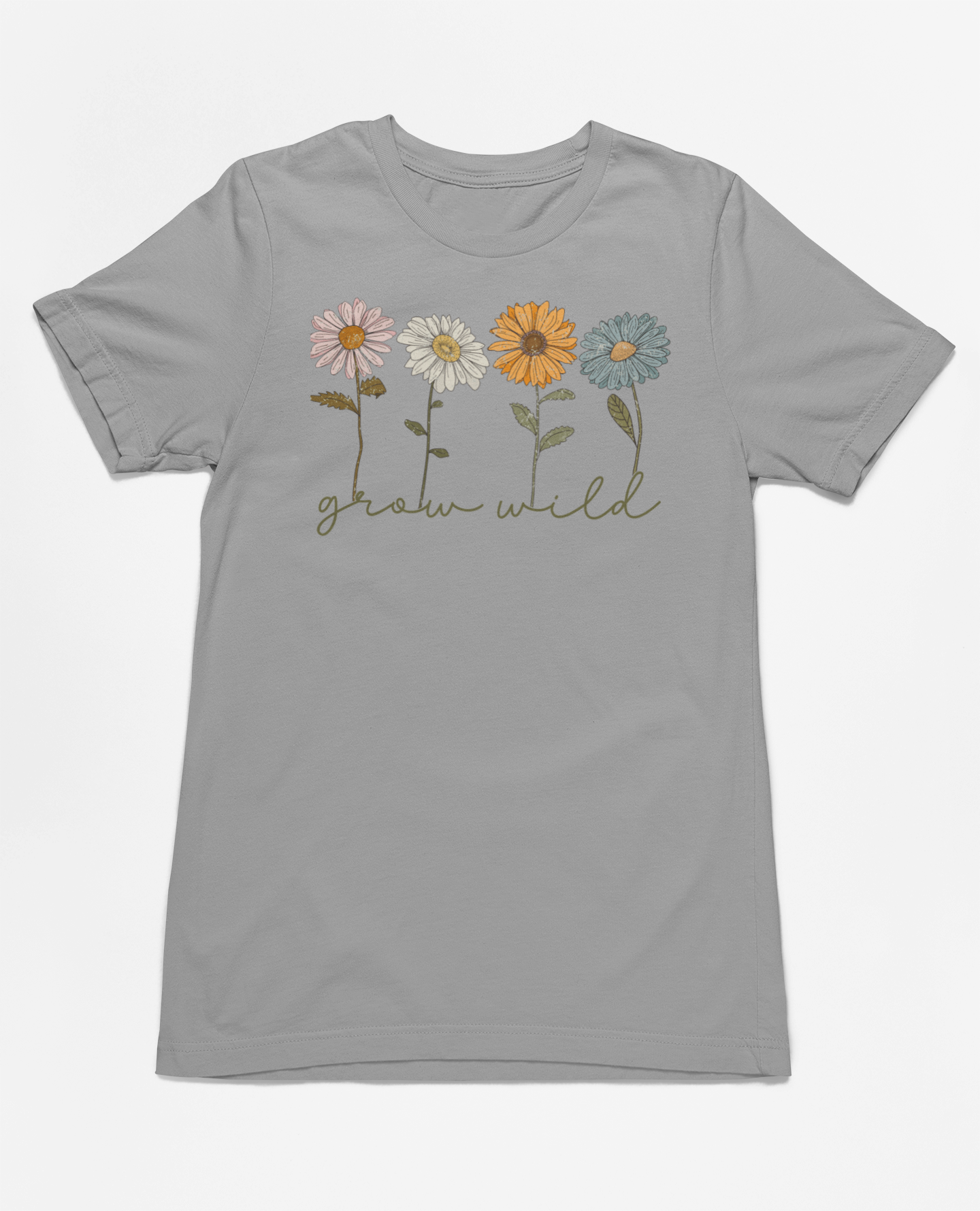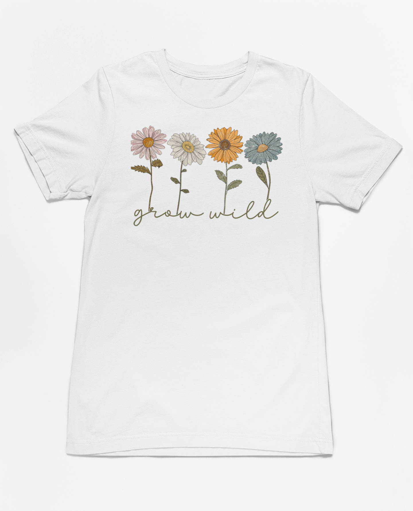 Let your free spirit bloom with our "Grow Wild" graphic tee! Featuring a row of colorful daisies and a whimsical script, this design is a gentle reminder to embrace your uniqueness and grow where life plants you. Made with soft, breathable fabric, it’s perfect for casual outings, cozy days, or layering up in style. Add a pop of floral fun to your wardrobe today—because growing wild is always in season!