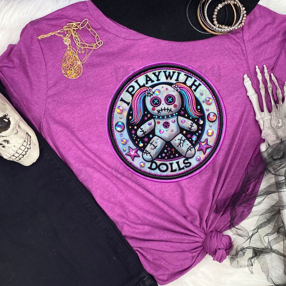 Unleash your playful side with the I Play With Dolls Faux Embroidery tee. Express your love for dolls in a unique and fun way with this quirky top. Perfect for any casual occasion, this tee is sure to make a statement and bring a smile to everyone's face. (No dolls were harmed in the making of this shirt!)