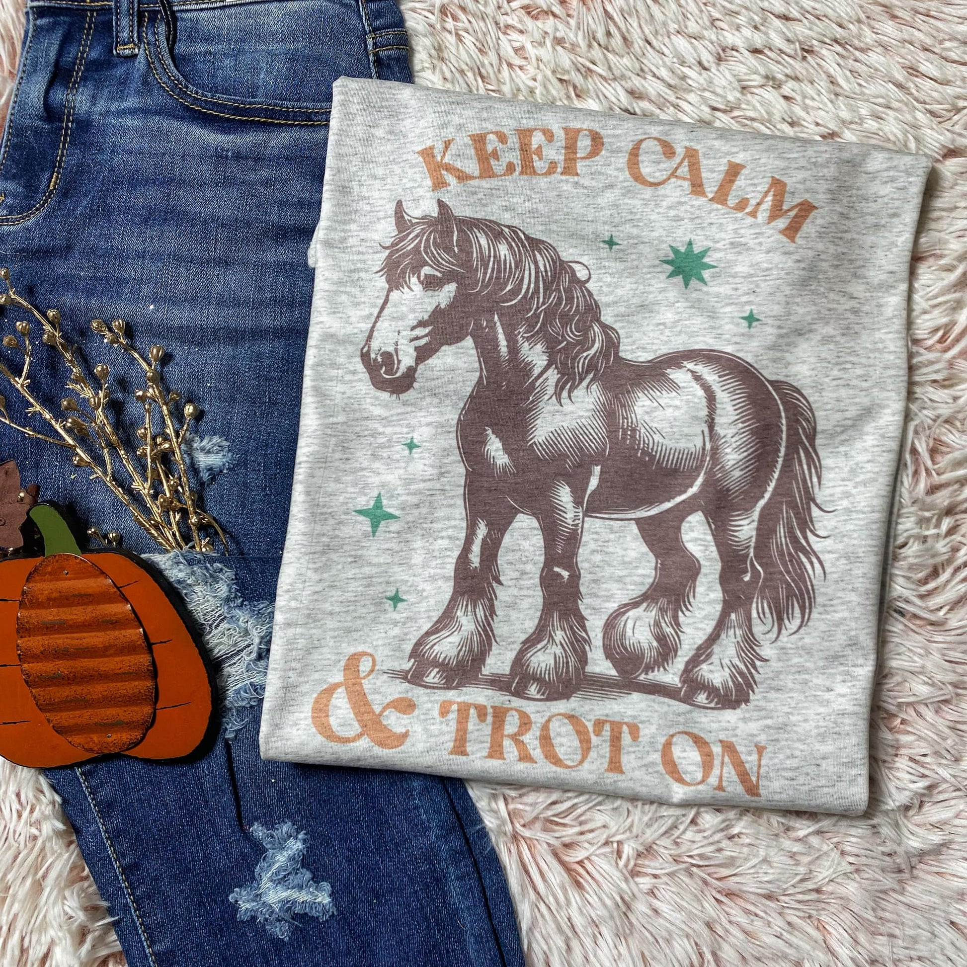 Stay cool and keep trotting on with our Keep Calm and Trot On tee, featuring a horse design. Perfect for horse lovers, this tee will have you looking stylish while showing off your love for these majestic creatures. Keep trotting on!