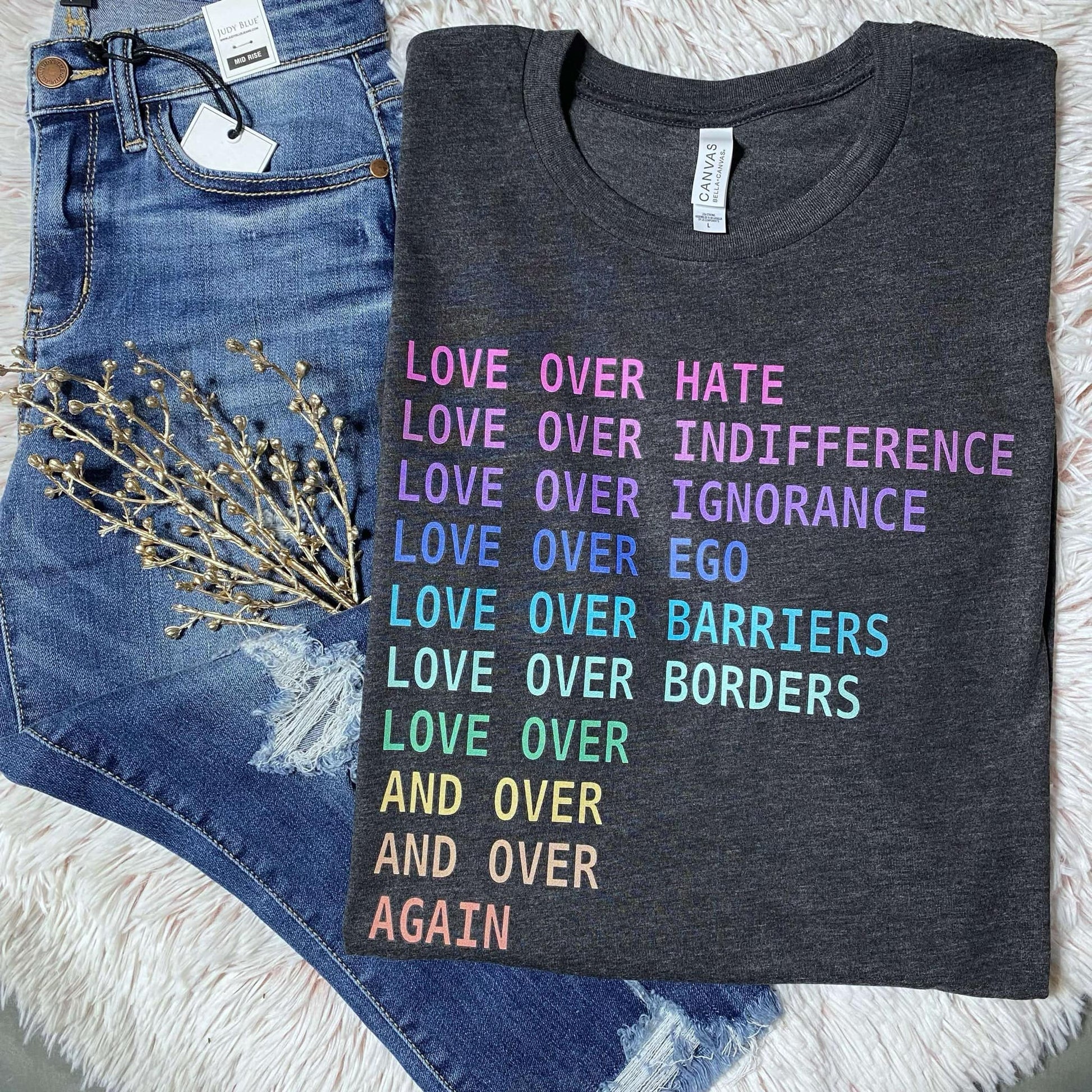 Spread love and stand against hate with our Love Over Hate graphic tee. Featuring colorful letters and powerful messages of love over indifference, ignorance, ego, barriers, and borders, wear this tee proudly and share the message of love over and over again.