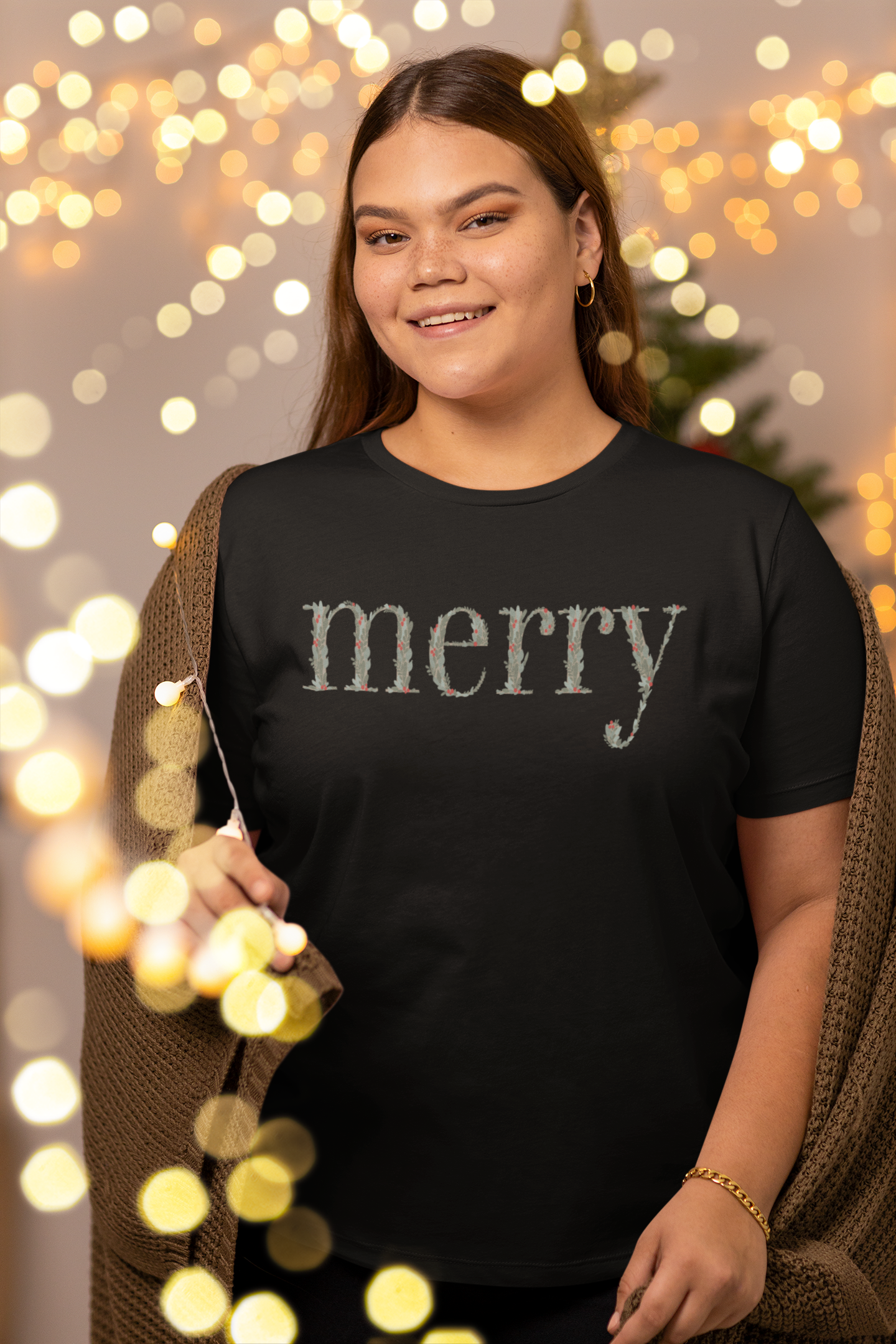 Keep it simple yet festive with our "Merry" minimalist graphic tee! Featuring the word "Merry" in a delicate design adorned with subtle holiday greenery and berries, this shirt is perfect for those who love understated holiday style. Made from ultra-soft fabric, it’s cozy enough for lounging by the fire yet stylish enough for holiday gatherings. Add this timeless Christmas shirt to your wardrobe and spread subtle festive cheer wherever you go!