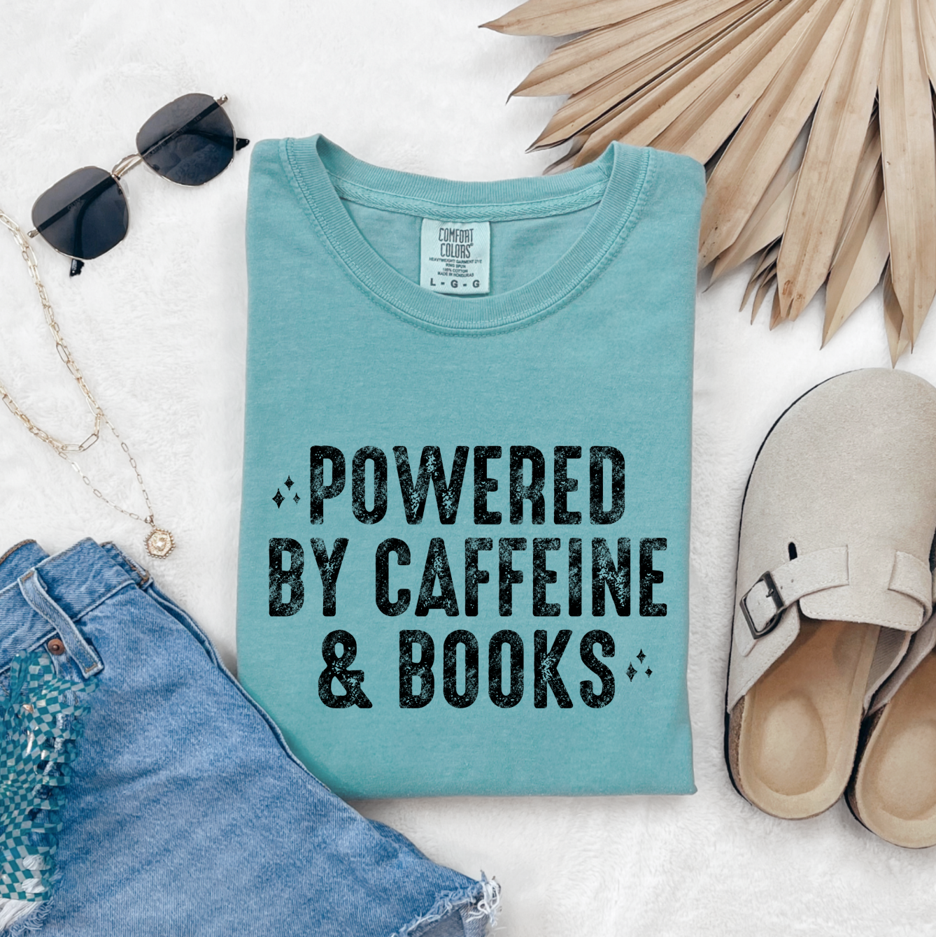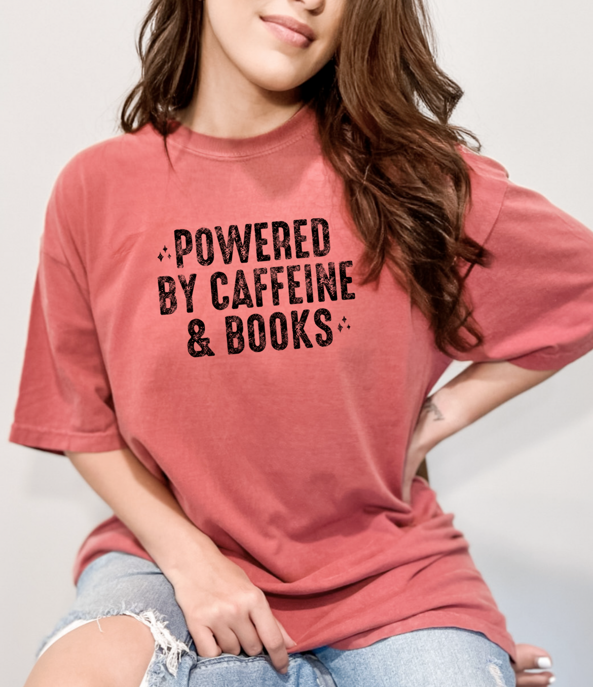Boost your energy and knowledge with our Powered by Caffeine and Books tee! Fuel your passions with this quirky and fun shirt, perfect for book lovers and caffeine addicts alike. Don't let anything hold you back from conquering the day!