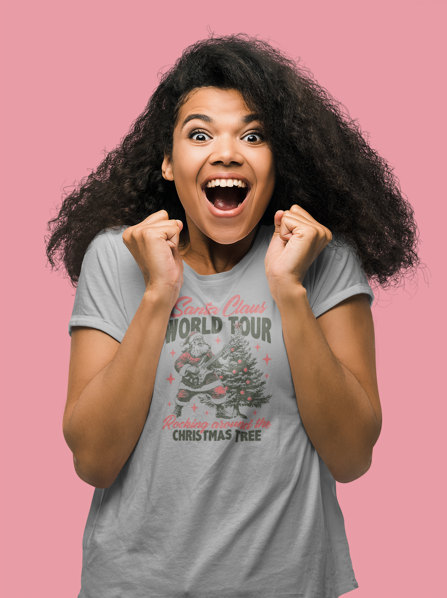 Get ready to rock this holiday season with our "Santa Claus World Tour" graphic tee! Featuring Santa shredding on his guitar while "Rocking Around the Christmas Tree," this festive design is perfect for music lovers and Christmas enthusiasts alike. Made from ultra-soft fabric, this holiday shirt is as comfortable as it is fun—ideal for parties, concerts, or cozying up by the fire. Add this playful Christmas tee to your collection and bring some rock ‘n’ roll cheer to the season!