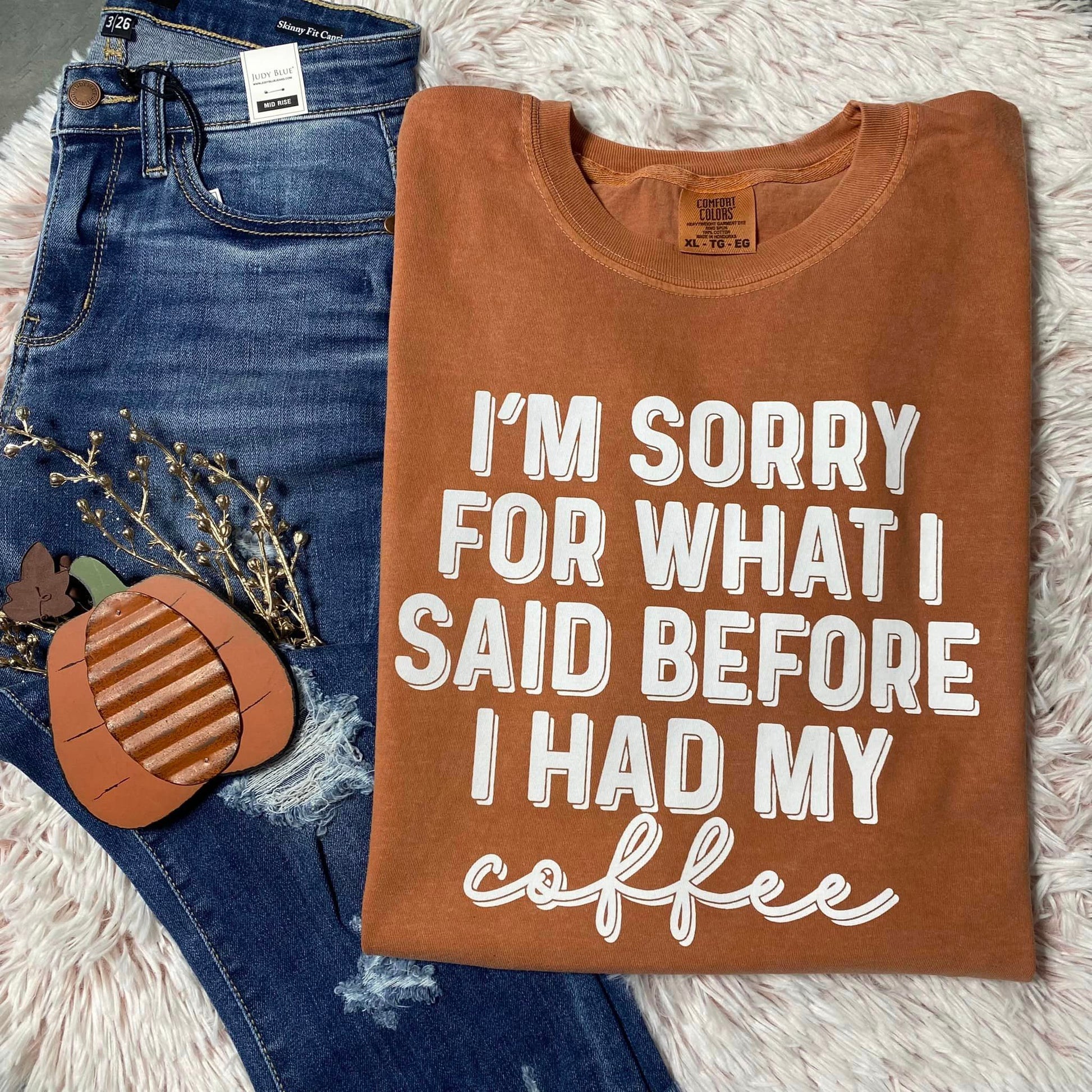 Get ready to make amends with our 'Sorry for what I said' tee! Perfect for coffee lovers, this shirt apologizes in advance for any potential outbursts before that first sip. Say sorry in style and keep the peace, with a touch of humor.