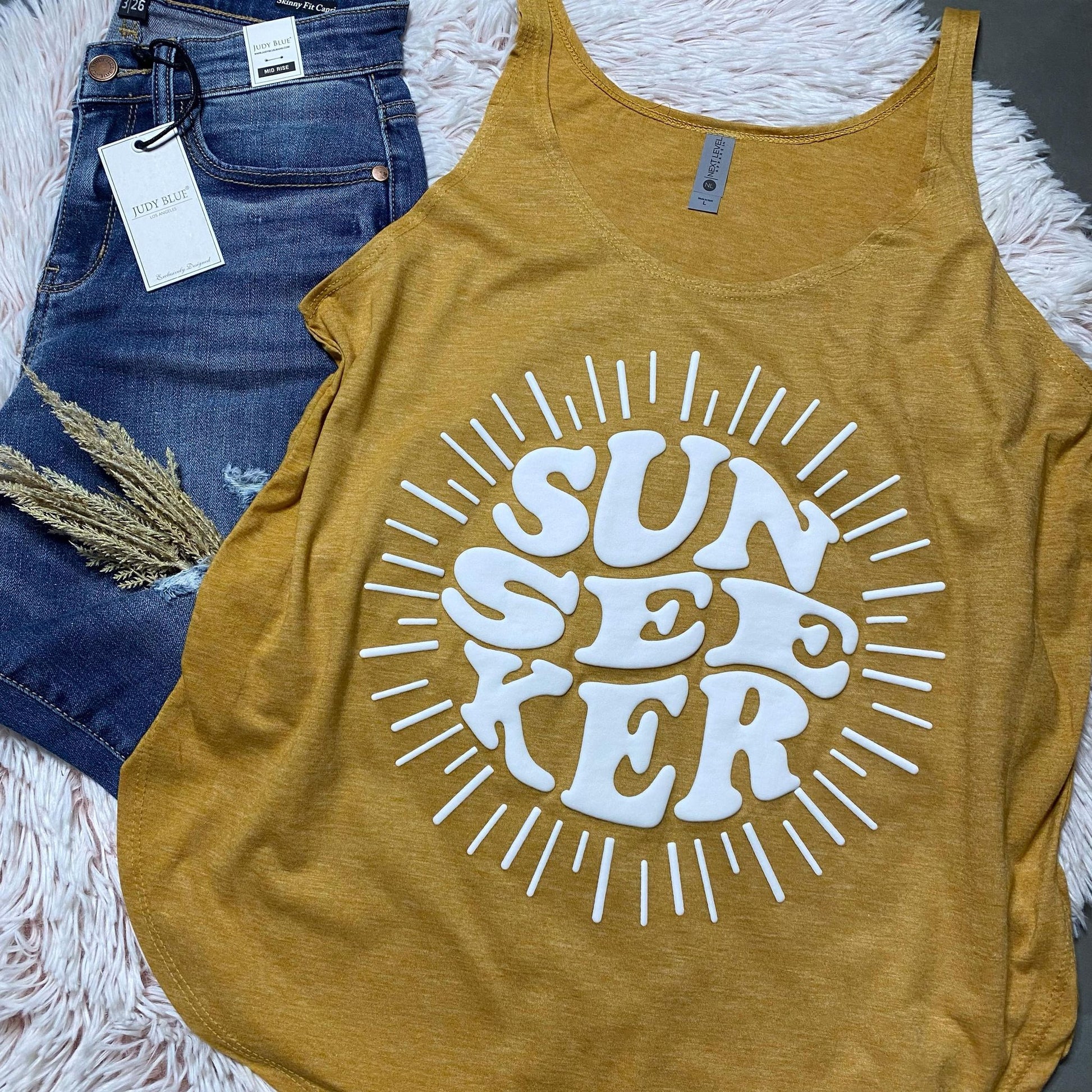 Shine bright in our Sunseeker tee! This stylish top will have you craving for the warm sun and carefree vibes. Made with comfortable materials, you'll feel as good as you look. Perfect for your next beach adventure or for simply soaking up some rays. Get it now before it's gone! ☀️